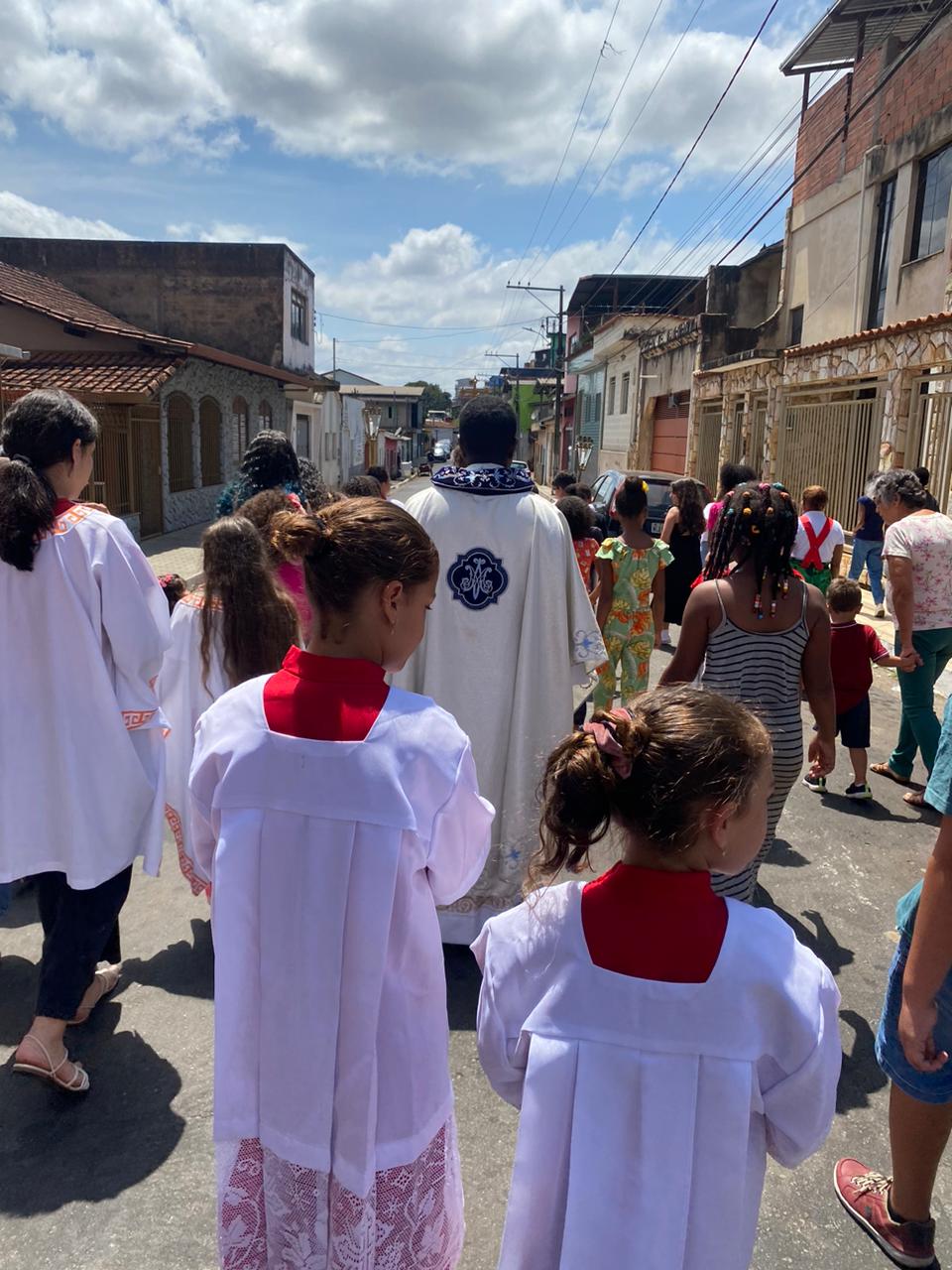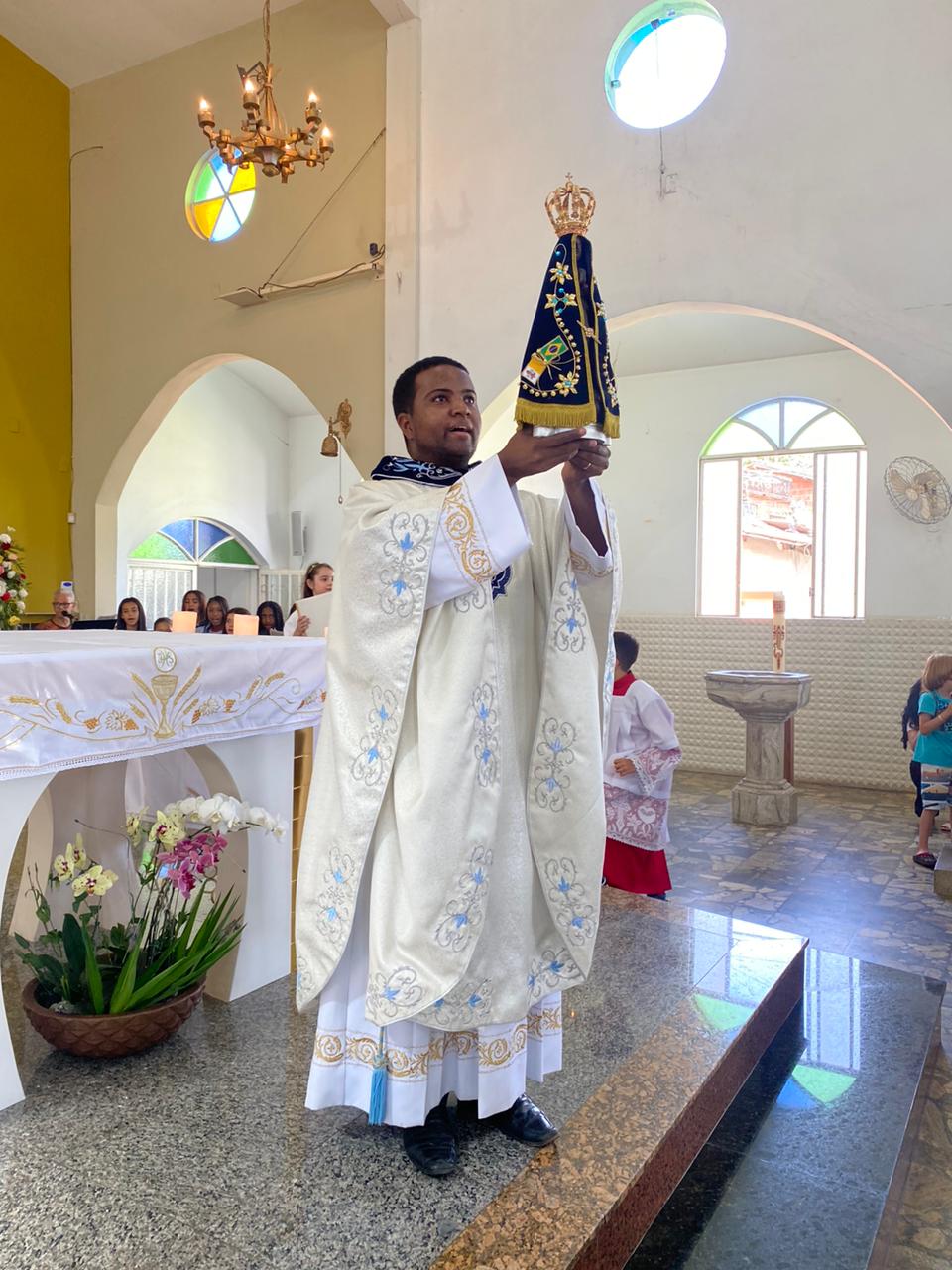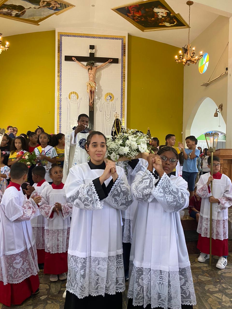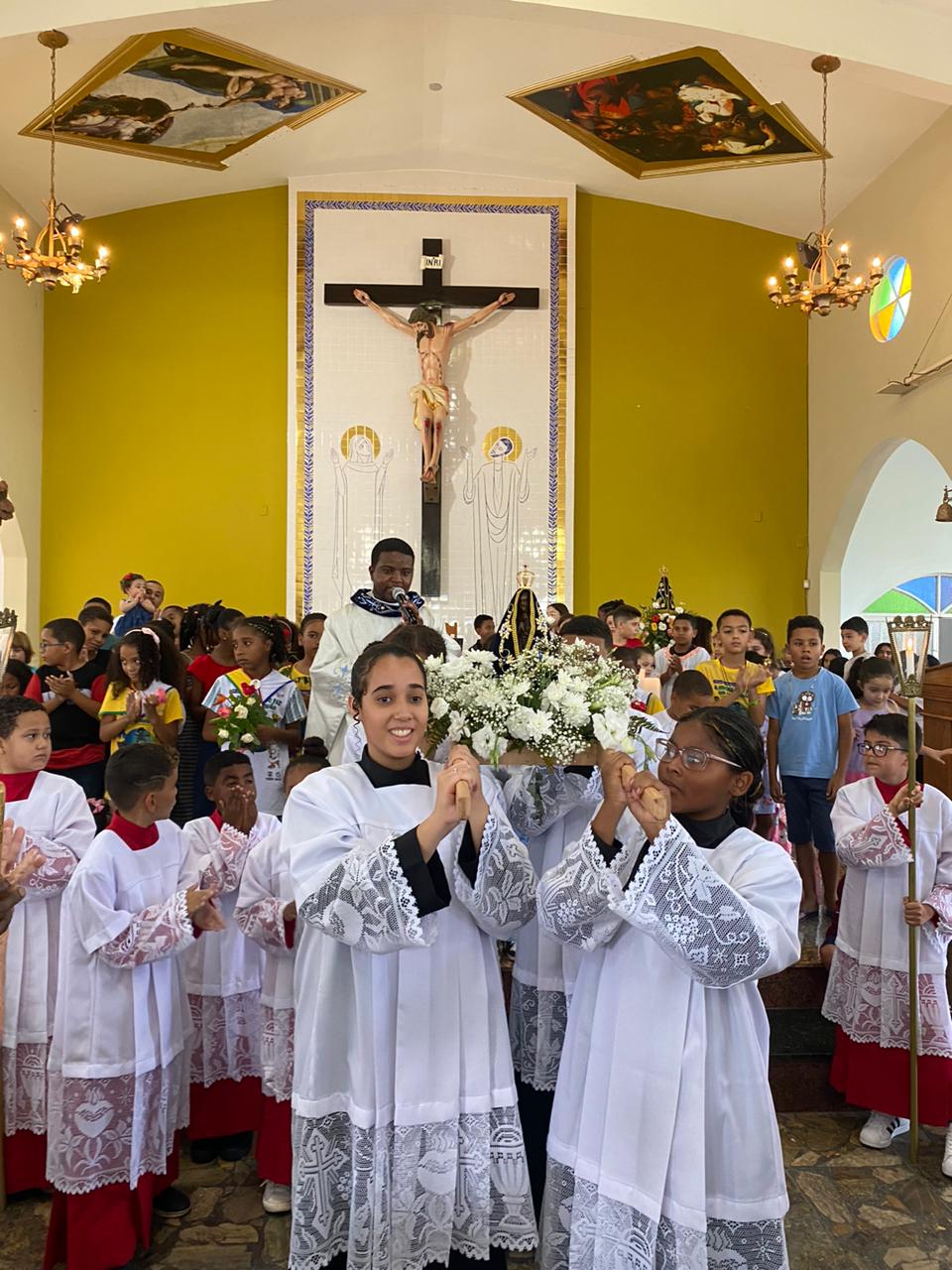 A celebração foi presidida pelo Pe. Gustavo, adm. Paroquial. No termino da celebração fizeram uma linda procissão. Neste dia que celebramos o dia das crianças pedimos a intercessão e proteção de Nossa Senhora Aparecida para todas as crianças.