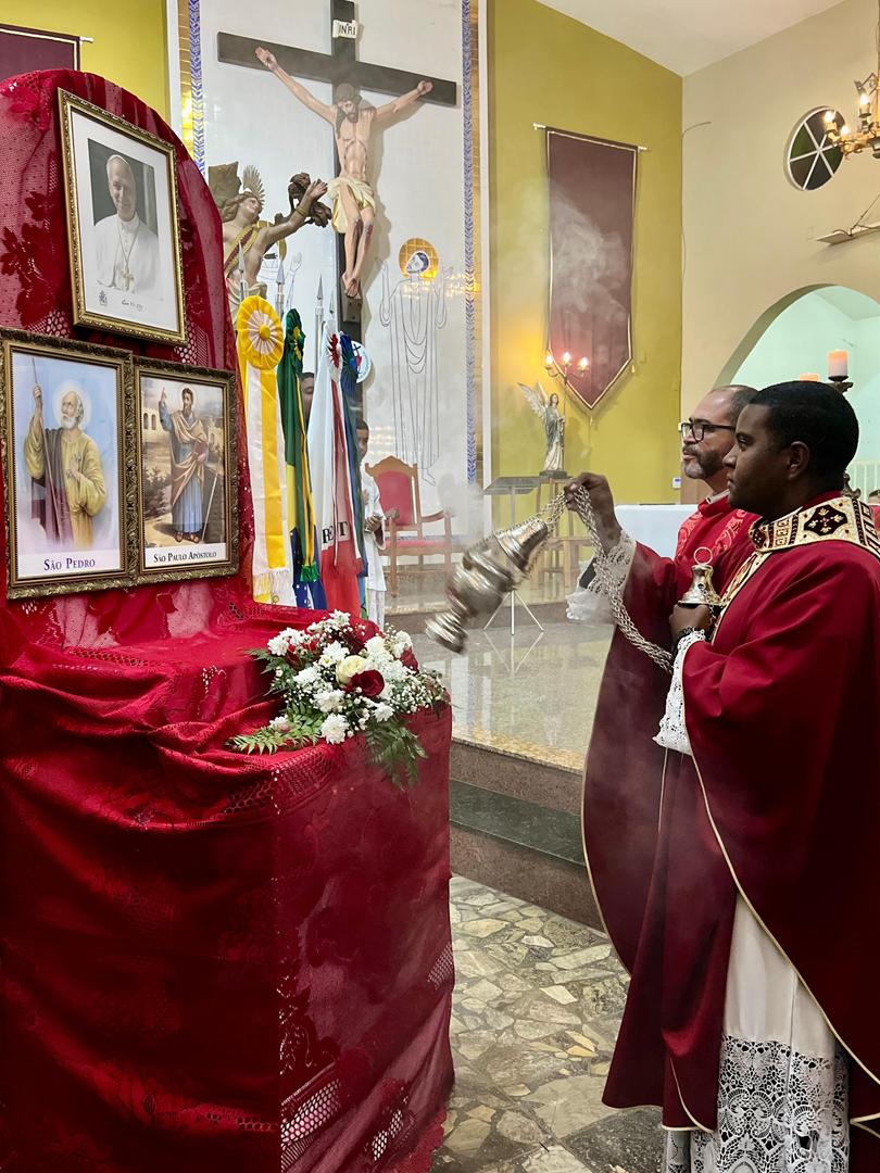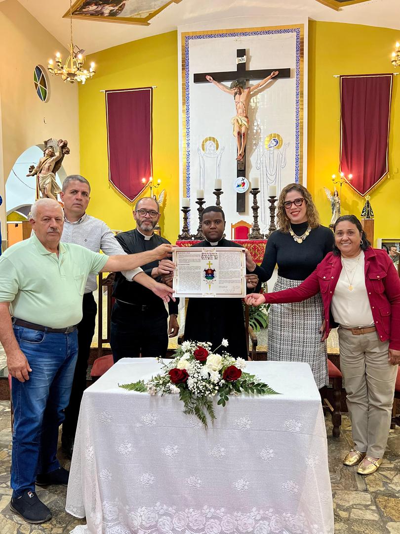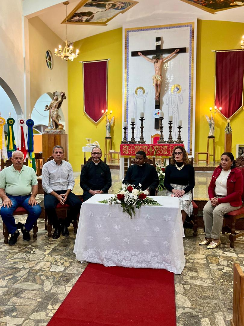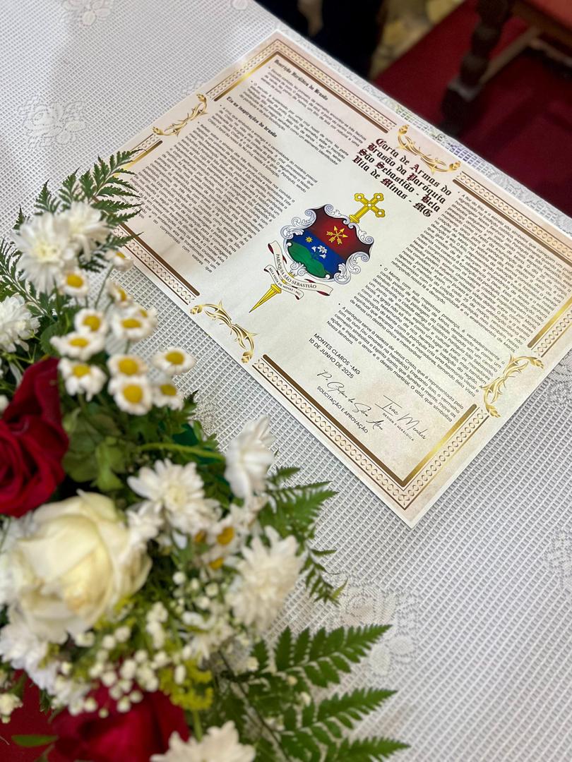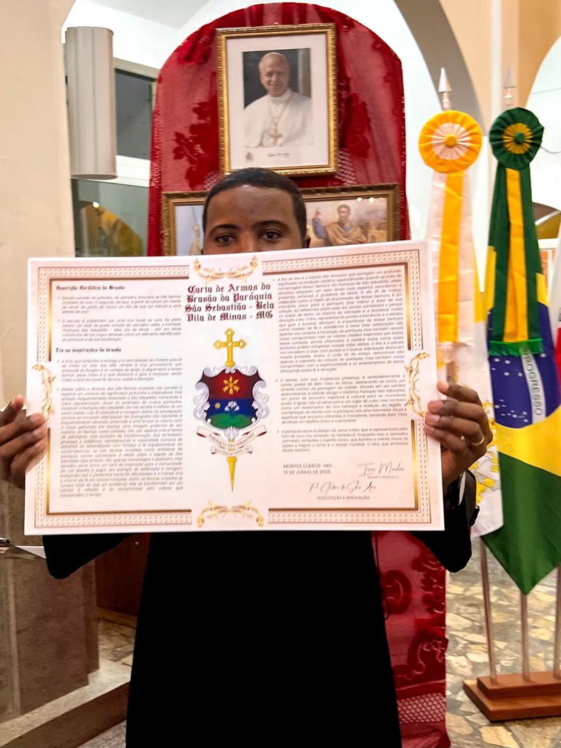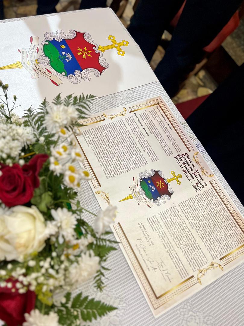 Aos 29 dias do mês de junho de 2025, foi um dia muito significativo para nossa Paróquia, pois num momento cívico contando com a participação do Reverendíssimo Pe. Gustavo da Silva Alves, Pároco desta Paróquia; o Reverendíssimo Diácono Geraldo Carvalho; a Excelentíssima Prefeita, Sra. Samantha Aparecida de Ávila Costa Magalhães; da Vossa Excelência Aldrin Lage De Oliveira, Presidente da Câmara Municipal; a Ilustríssima Senhora Mônica Arcanjo, representando o Conselho de Pastoral Paroquial; o Ilustríssimo Senhor João Camilo, representando o Conselho Econômico Paroquial e uma grande assembleia de fiéis tivemos a grata satisfação de conhecer o brasão da nossa Paróquia e o significado de cada símbolo contido nele e fomos chamados a meditar sobre como estes símbolos podem influenciar nossas vidas diárias e, através deste brasão, a cada 25 de março, data que nos lembra a criação da Paróquia, renovarmos também nosso compromisso com a espiritualidade e os ensinamentos de Maria, reforçando nossa fé e devoção. Padre Gustavo enfatizou que “explorar o significado do brasão da Paróquia São Sebastião é como abrir um livro de histórias repleto de simbolismo e riqueza espiritual”. E, junto à cada símbolo apresentado, reforçava nossa ideia do pertencimento a esta Paróquia abençoada por São Sebastião, nosso padroeiro. Em seguida, participamos da Santa Missa da Solenidade de São Pedro e São Paulo, as duas colunas da Igreja. Agradeçamos a Deus pela presença e atuação do nosso pároco, Pe. Gustavo Silva, que nos ajuda a valorizar cada momento vivido em comunidade e a crescer na fé como filhos Amados de Deus.